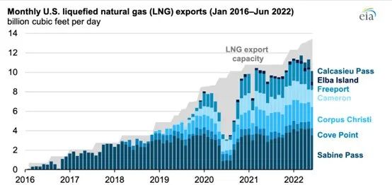 圖2 2016年1月-2022年6月美國LNG項目出口能力變化情況