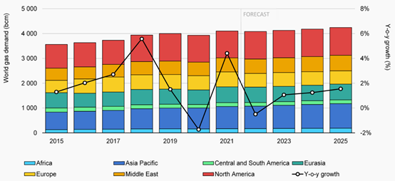 圖1 2015-2025年全球天然氣需求變化情況